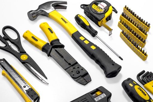 Śrubokręty, Grzechotki, Młotek, Pistolet do kleju, Poziomica, Szczypce do izolacji, Wkrętaki, Nożyczki, Nóż do tapet, Metrówka, Zaciski,