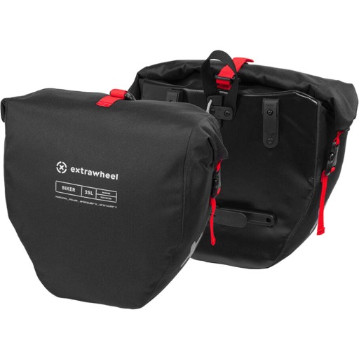 Sakwy Extrawheel Biker to bardzo wszechstronny komplet o całkowitej pojemności 50 l (2 x 25 l), który doskonale nadaje się zarówno na wymagającą wyprawę rowerową, jak i do codziennych miejskich przejażdżek, jeśli chcemy mieć możliwość transportować spory bagaż.