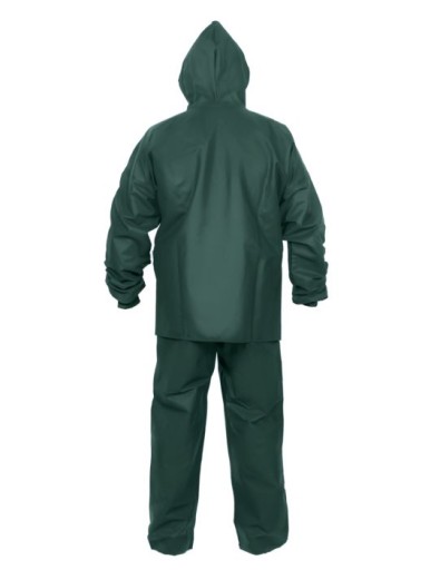 Ubranie złożone z kurtki z kapturem zapinanej na napy oraz spodni ogrodniczek z regulowanymi szelkami z elastyczną, szeroką gumą z tyłu. Model produkowany z wodoochronnej tkaniny powlekanej Plavitex.