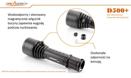 ORCATORCH D500 + to przenośna latarka sterowana magnetycznie do profesjonalnego nurkowania. Jest on wyposażony w całkowicie zamknięty, sterowany magnetycznie przełącznik boczny, który zapewnia elastyczne działanie pod wodą.Korzystając z najnowszej diody LED CREE XM-L2 (U4) firmy USA, maksymalnej wydajności 1000 lumenów i ponad 18 godzin pracy, przenośne światło nurkowe oferuje trzy poziomy jasności i jeden tryb stroboskopowy do różnych zastosowań w nurkowaniu.