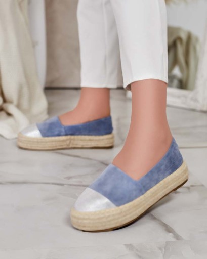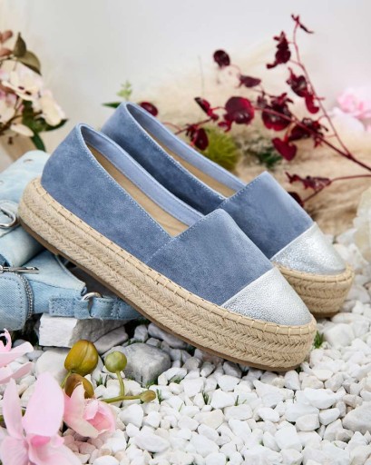 Wyjątkowe damskie espadryle wykonane z eko skóry zamszowej i tkaninowej wkładki. Płaska podeszwa zdobiona sznurkiem jutowym zapewnia wygodę. Model wsuwany. Doskonały dodatek do letnich stylówek!