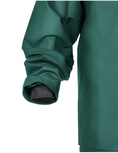 Ubranie złożone z kurtki z kapturem zapinanej na napy oraz spodni ogrodniczek z regulowanymi szelkami z elastyczną, szeroką gumą z tyłu. Model produkowany z wodoochronnej tkaniny powlekanej Plavitex.