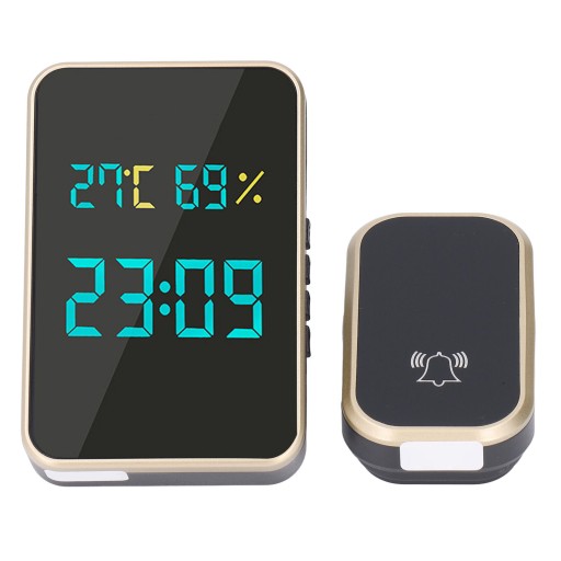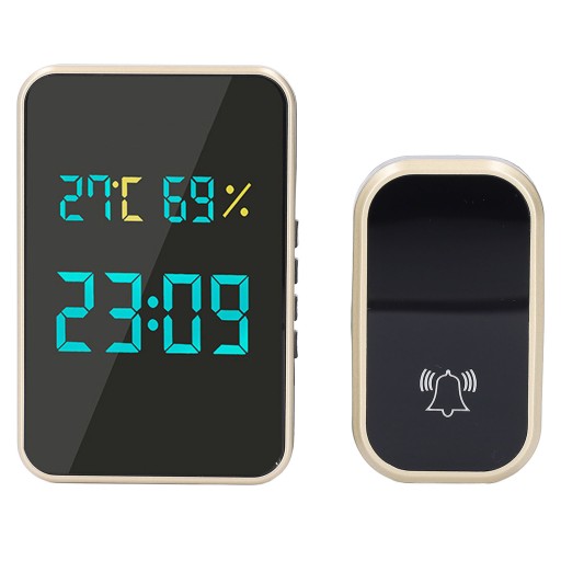 Bezprzewodowy dzwonek do drzwi z własnym zasilaniem 38 dzwonków 4-poziomowy elektroniczny dzwonek do drzwi z wyświetlaczem temperatury i czasu w kolorze czarnym i złotym