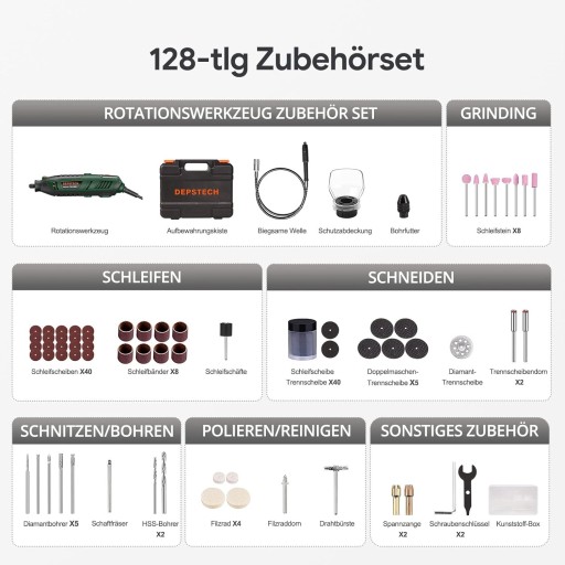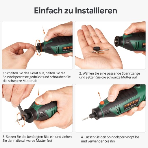 - Narzędzie obrotowe DEPSTECH jest wyposażone w 3-szczękową uniwersalną tuleję zaciskową, która umożliwia szybką i łatwą wymianę akcesoriów w narzędziu obrotowym.