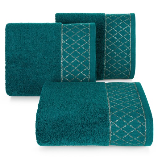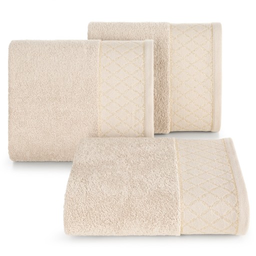 Ręcznik z ozdobną bordiurą w pasy kolekcji MARI o gramaturze 500gsm, która zapewnia wysoki komfort użytkowania, doskonałą chłonność oraz szybkie schnięcie. Ręczniki są w 100% bawełniane a część ozdobna składa się w 60% z bawełny oraz 40% poliestru.