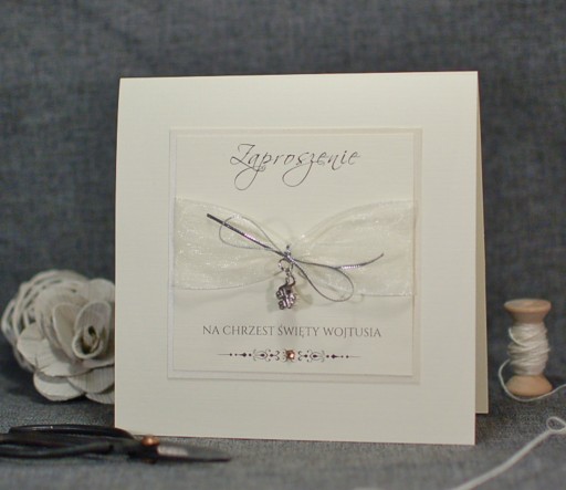 w kolorze białym lub ecru, ozdobione tasiemką i zawieszką.