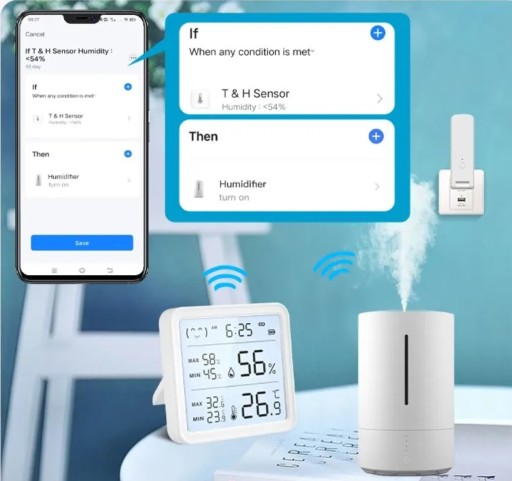 Czujnik temperatury i wilgotności BLE przy współpracy z inteligentnym sterownikiem ogrzewania podłogowego pozwala na sterowanie ogrzewaniem podłogowym w twoim domu. Stosując dodatkowy kontroler WiFi IR, czujnik temperatury i wilgotności WiFi umożliwia sterowanie większością klimatyzatorów oraz nawilżaczy powietrza posiadających pilota. Dzięki swojej uniwersalności czujnik WiFi po ustawieniu odpowiednich scen w aplikacji daje więc możliwość zarządzania pracą ogrzewania podłogowego zimą oraz klimatyzacji latem. Rozwiązanie to pozwala na uzyskanie optymalnej temperatury oraz wilgotności powietrza w twoim domu przez cały rok.