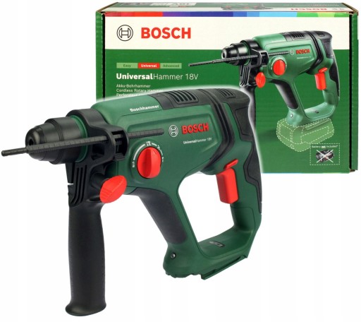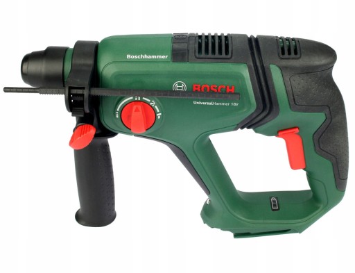 Młotowiertarka model UniversalHammer 18V firmy BOSCH to specjalistyczne urządzenie z dużą skutecznością i wydajnością pracy. Posiada porównywalne parametry techniczne co młotowiertarka z zasilaniem elektrycznym. Zoptymalizowany mechanizm udarowy z funkcją kucia pozwala na wiercenie w betonie otworów o maksymalnej średnicy 16 mm, a dzięki energii udaru wynoszącej - 2,0J, jest równie szybka jak młotowiertarka z zasilaniem elektrycznym klasy 2kg.