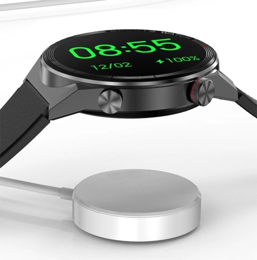 Smartwatch ładowany jest indukcyjnie. Wystarczy, że położymy zegarek na dołączonej do zestawu ładowarki i rozpocznie się ładowanie. Ładowarka oczywiście musi być podłączona do ładowarki sieciowej lub portu USB komputera.