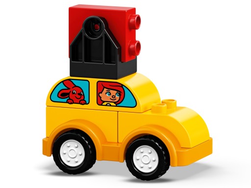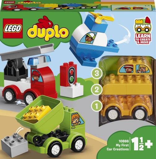 Przedszkolakom spodoba się zabawa w budowanie i przebudowywanie kolorowych pojazdów z zestawu LEGO DUPLO 10886 Moje pierwsze samochodziki. Pomóż dziecku posortować klocki i zbudować z nich zabawkowy helikopter, taksówkę, śmieciarkę i wóz strażacki. Potem pomieszajcie klocki i zbudujcie własne pojazdy — to proste, bo wystarczy połączyć kilka dużych klocków DUPLO.