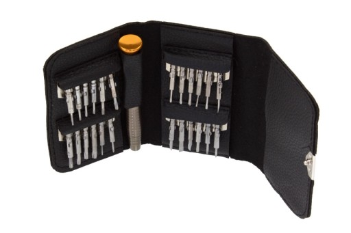 Wkrętaki pasują do wszystkich śrubek i wkrętów używanych w urządzeniach elektronicznych. Całość zapakowana w poręczne i eleganckie etui w kształcie portfela.