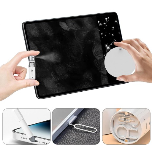 dokładniego szczerbca do czystego ekranu, aby wytrzeć go pogrzebe. Wiatrówka łatwo usuwa pył z urządzeń. Miotła do czyszczenia wykrywa czyści plamy z ekranów komórkowych i urządzeń fotograficznych.
