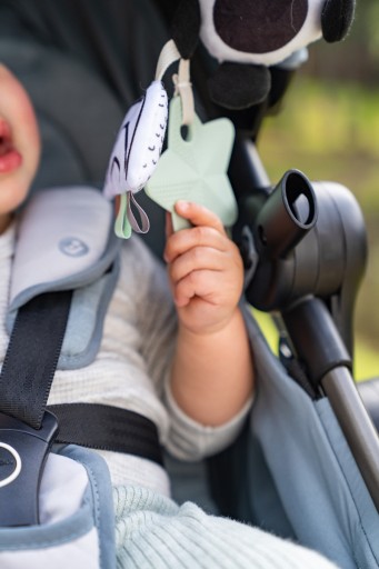 Użyj pierścienia, aby powiesić zabawkę na wózku lub łóżeczku – zapewnisz tym samym zabawę dziecku w domu i podróży.