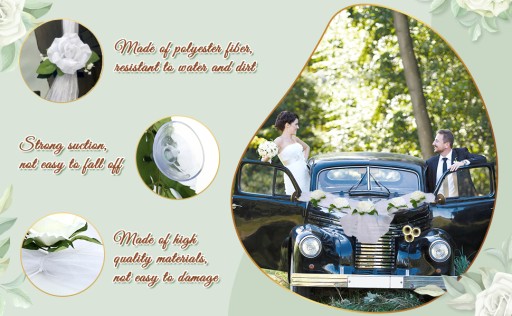 Łatwy w użyciu zestaw do dekoracji samochodu ślubnego jest wyposażony w przyssawki, jest bardzo łatwy w montażu i można go przymocować do dowolnej gładkiej powierzchni.