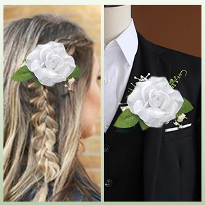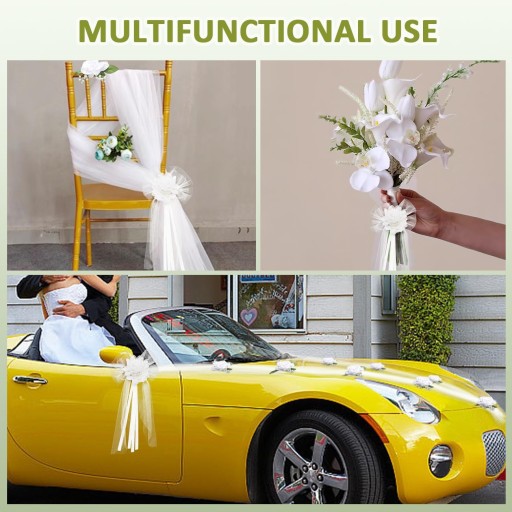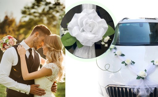 Dekoracja samochodu ślubnego zawiera 9 białych sztucznych róż (średnica 10 cm) i 2 muśliny (1.6M). Dzięki doskonałemu wykonaniu dekoracja kwiatowa jest wykwintna i wygląda jak prawdziwe kwitnące róże.