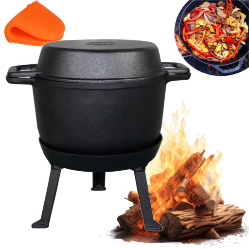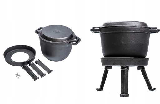 ⭐ Niezaprzeczalnym atutem kociołka jest nowatorskie rozwiązanie 3w1 które pozwala na różne wykorzystanie kociołka. Jako tradycyjny garnek myśliwski, patelnię grillową, lub stojak