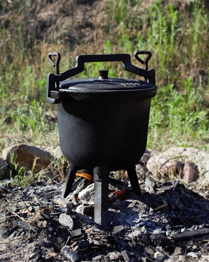 ▶️ Kociołek wyposażony jest w solidną pokrywę, trzy stabilne nóżki oraz uchwyt ułatwiające przenoszenie.