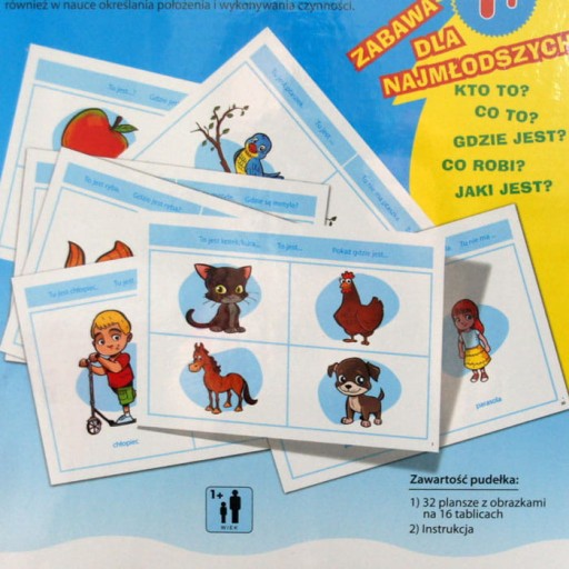 Zestaw składa się 32 plansz z obrazkami przedstawiającymi obiekty z najbliższego otoczenia dzieci. Dzięki odpowiednio zadawanym pytaniom (zawartym na planszach) stymulujemy naukę mowy oraz ćwiczymy poprawne budowanie wypowiedzi. Zabawka pomaga w nauce nazw rzeczy, czynności, określania położenia oraz cech przedmiotów, odróżniania liczby pojedynczej od mnogiej oraz tworzenia odpowiedniej formy gramatycznej wypowiedzi.