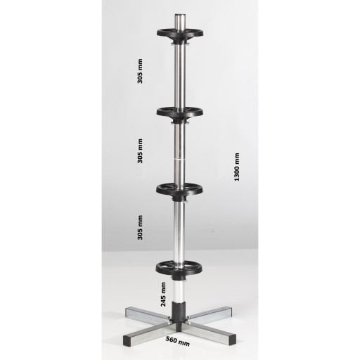Powierzchnia podpór jest bezpieczna dla felg. Przechowywanie kół na stojaku w okresie zimowym lub letnim zapobiega powstawaniu odkształceń i ma wpływ na ich lepszy stan oraz dłuższą żywotność. Dodatkowym atutem jest szybki i łatwy montaż stojaka. Maksymalna ładowność 120 kg.