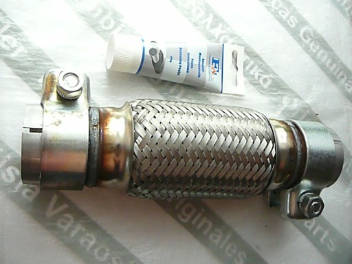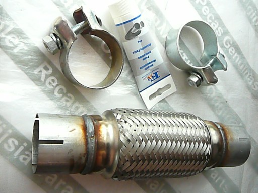 Prowadzę hurtownię motoryzacyjną oraz sprzedaż wysyłkową. Zapraszam do zakupu wzmocnionego, szczelnego złącza elastycznego. Redukuje ono drgania przenoszone z silnika na tłumik i karoserię. Jest to produkt nowy, a jego importem zajmuje się duża firma, specjalizująca się w układach wydechowych. Łącznik składa się z podwójnego peszla, oplecionego obustronnie kilkoma warstwami drutu oraz z przedłużonych kołnierzy. Całość jest stalowa, elastyczna, nierdzewna i wytrzymała na warunki atmosferyczne oraz wysoką temperaturę. Przewód ma zastosowanie do samochodów: