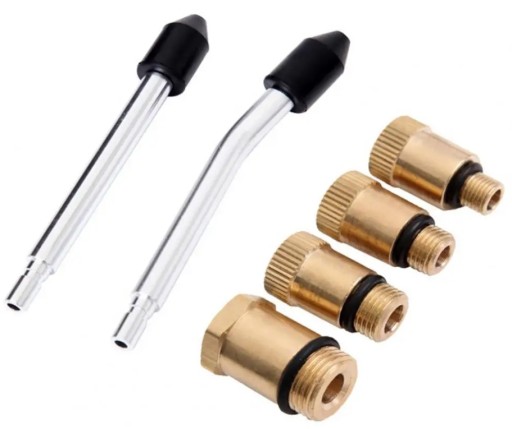 Zestaw posiada 4 adaptery oraz dwie rury z gumowymi końcówkami do pomiarów z dociskiem ręcznym, dzięki czemu jest uniwersalny i pasuje do większości samochodów.