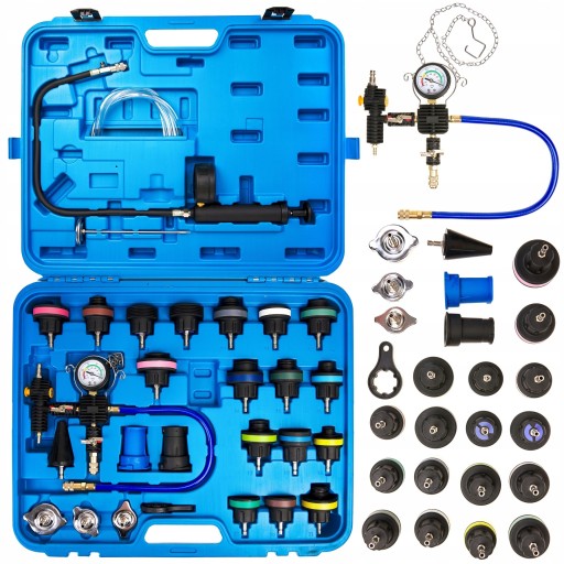 27-elementowy zestaw do testowania przecieków w chłodnicy, a tak że dokonania szybkiej zmiany chłodziwa. Oznaczone różnymi kolorami nakrętki ułatwiają wybór odpowiedniego korka testowego.
