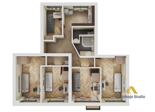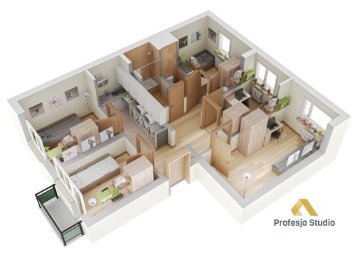 Tego typu wizualizacja 3D doskonale prezentuje całą aranżację. Wizualizacje 3d często stosowane są przez projektantów wnętrz, oraz sprzedawców projektów domów. W przejrzysty sposób pokazuje rozmieszczenie mebli w pomieszczeniu. Trójwymiarowy rzut, który jest nowoczesny, maksymalnie czytelny a do tego piękny.