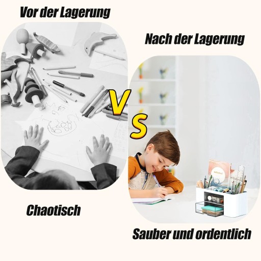 - Organizer jest wyposażony w 5 przegródek i 2 przezroczyste szufladki, dzięki czemu można uporządkować i przechowywać swoje codzienne rzeczy. Na przykład długopisy, nożyczki, karteczki samoprzylepne itd. jest najlepszym wyborem, aby utrzymać biurko w czystości i porządku.