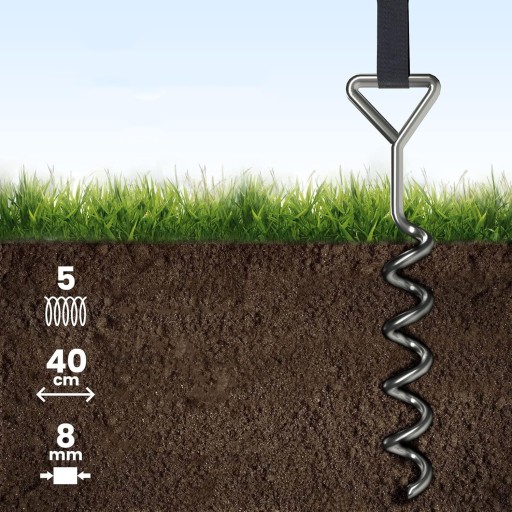 ➡️ Co otrzymasz: zestaw do mocowania składający się z 4 spiralnych kotwic do podłoża i 4 pasków poliestrowych. Nadaje się nie tylko do trampoliny, ale również do huśtawek, szklarni, namiotów, zjeżdżalni dla dzieci, wież do zabawy itp