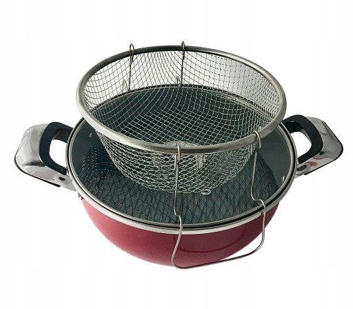 Teflonowy garnek 4.0L z koszem do smażenia frytek oraz innych potraw wymagających zanurzenia w głębokim oleju. Dzięki wyjmowanemu koszowi możemy łatwo zanurzać i wyjmować przygotowywaną potrawę w oleju. Garnek przystosowany do wszystkich typów kuchenek, także indukcyjnych. Nienagrzewające się uchwyty z tworzywa umożliwiają przenoszenie gorącego garnka bez ryzyka oparzenia się. Wyposażony w powłokę nieprzywierającą (Xylan). W zestawie szklana pokrywa z odpowietrznikiem.