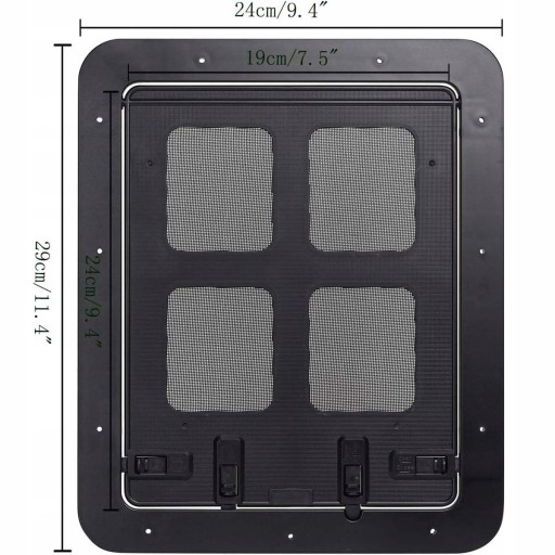 Wymiary zewnętrzne: 24 x 29 x 1 cm (szer. x wys. x gł.), wymiary wewnętrzne: 19 x 24 cm (szer. x wys.), wymiary wycięcia: 24 x 29 cm (szer. x wys.) ), odpowiedni dla kotów i psów o wadze poniżej 11,8 kg i obwodzie talii mniejszym niż 60 cm.