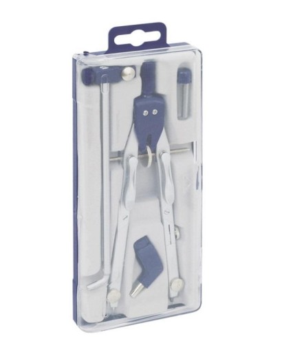4 elementy w zestawie: cyrkiel mikrometryczny 172 mm z mechanizmem śrubowym (oba ramiona łamane), końcówka cyrkla z uchwytem uniwersalnym, zapasowy grafit, przedłużacz