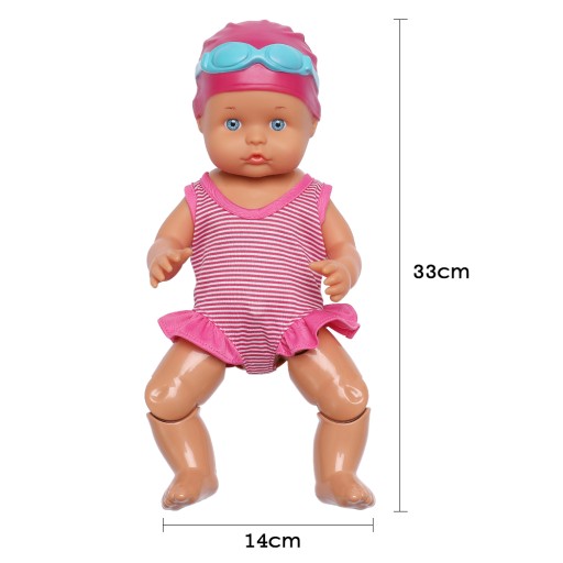 Lalka do kąpieli, która z pewnością umili czas każdej kąpieli Twojej córeczki w domu bądź na basenie. Wystarczy nacisnąć guzik na brzuszku, a lalka zacznie ruszać swoimi nóżkami. Potrafi pływać na plecach i na brzuszku. Warto abyś podtrzymywała ją w tej trudnej nauce pływania. Lalka ubrana jest w różowy strój kąpielowy, a na główce ma czepek i okulary do pływania.