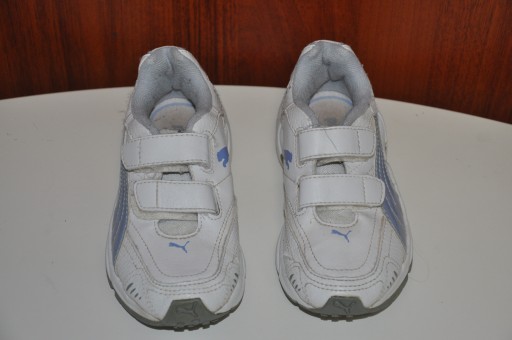 Puma - fajne białe adidasy na rzepy, rozmiar 28 (dł. wkładki 17 cm) z elementami niebieskiego.
