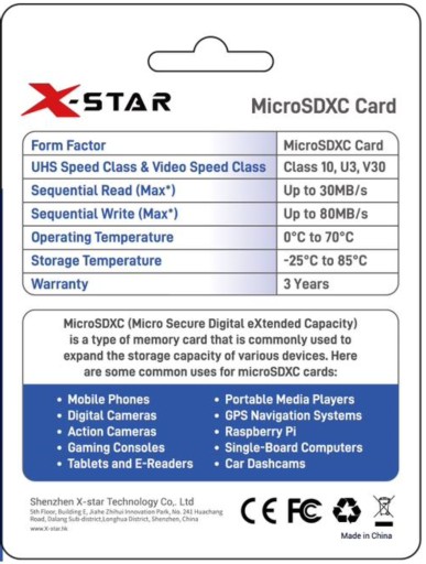 Karty X-Star microSDXC są kompatybilne z szeroką gamą urządzeń, w tym telefonami komórkowymi, aparatami cyfrowymi, kamerami sportowymi, konsolami do gier, tabletami, czytnikami e-booków, odtwarzaczami multimedialnymi, systemami nawigacji GPS, Raspberry Pi, a także rejestratorami samochodowymi. Dzięki dużej pojemności możesz przechowywać tysiące zdjęć, godzin nagrań wideo oraz setki aplikacji bez obaw o brak miejsca.