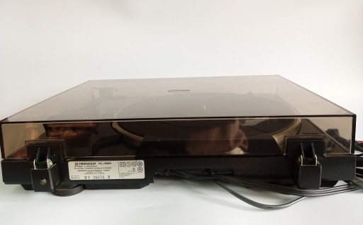 Używany, sprawny gramofon półautomatyczny z napędem paskowym PIONEER PL-480. Jak na wiek w dobrym stanie. Pokrywa lekko zmatowiała i ma trochę rysek, nie jest pęknięta.