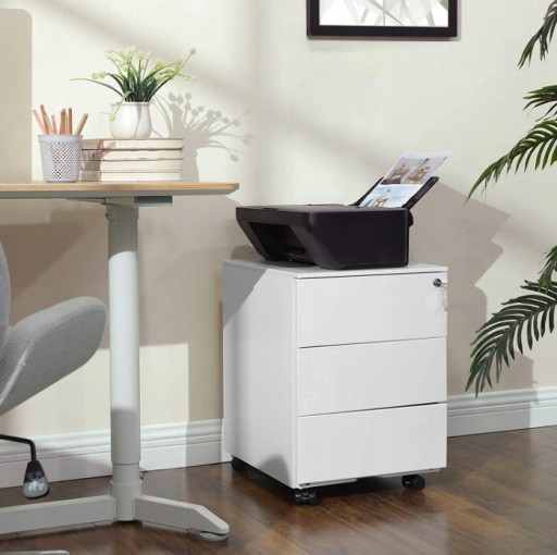 Za pomocą zamka można bezpiecznie zamknąć wszystkie 3 szuflady. Kółka obracają się o 360 stopni i przetaczają szafkę w dowolne miejsce. Dzięki swoim rozmiarom mieści się również pod biurkiem