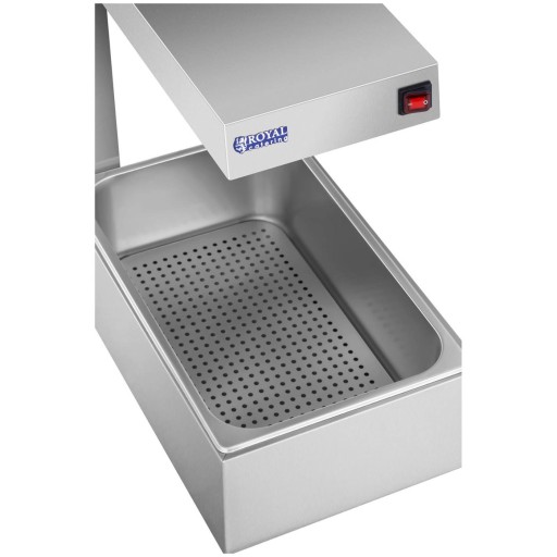 Efektywność podgrzewacza gastronomicznego od Royal Catering uzyskano dzięki halogenowej lampie grzewczej o mocy 500 W. Generowane przez nią ciepło podgrzewa produkty spożywcze do 80°C. Ponadto sprzęt wyposażony jest w pojemnik GN 1/1 (głębokość 150 mm, pojemność 19 litrów). Nasze urządzenie pozwoli utrzymać duże porcje żywności w optymalnej temperaturze, a dzięki białemu światłu zawartość prezentuje się bardzo apetycznie.