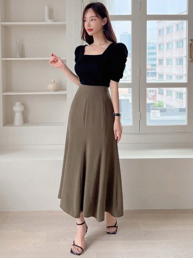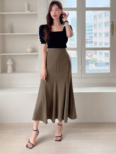 WYSOKI STAN FALBANA DAZY M KHAKI SPÓDNICA MIDI GŁADKA ROZKLOSZOWANA