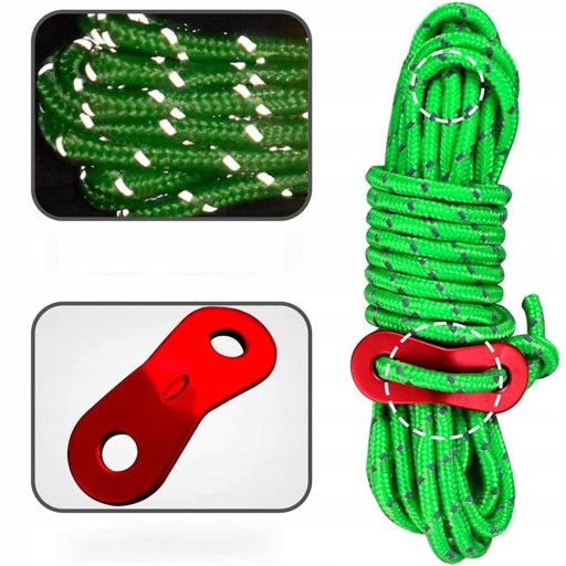 🏕️ Każda lina ma 4 metry długości i średnicę 4 mm. Każda lina może utrzymać do 200 kg. W zestawie 10 lin namiotowych.