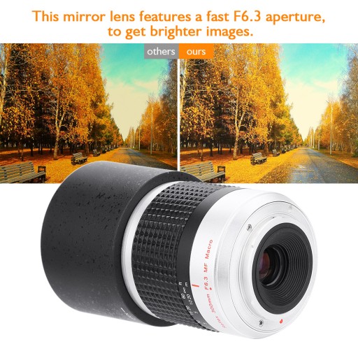 - Ten lustrzany obiektyw ma szybką przysłonę F6.3, co pozwala uzyskać jaśniejsze obrazy.