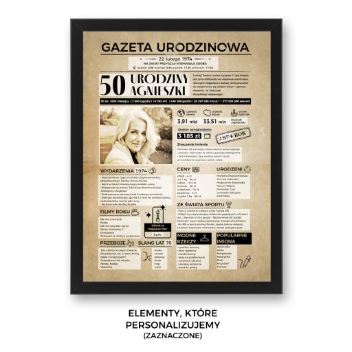 2. Jesteśmy w stanie wykonać plakat na dowolne urodziny. Na wizualizacji znajduje się wyłącznie przykład z 1974 r. Wszystkie dane personalizujemy sami pod zamówiony rocznik.