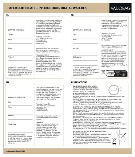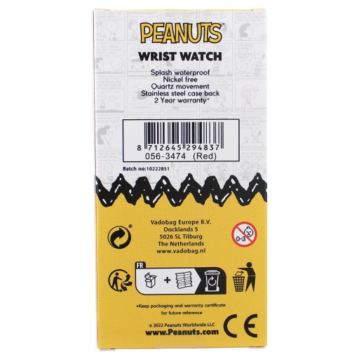 Duże i małe wskazówki są czerwone, a wskazówka sekundowa jest również wyraźnie widoczna dzięki żółtemu kolorowi. Zegarek ten można dostosować do każdego nadgarstka, ponieważ klamra RVC może być ciaśniejsza i luźniejsza. Zegarek jest bryzgoszczelny i objęty 2-letnią gwarancją. Ten przedmiot jest dostarczany w specjalnie wykonanym pudełku, dzięki czemu unikalny zegarek Snoopy nie ulegnie uszkodzeniu.