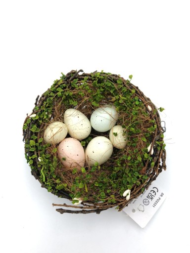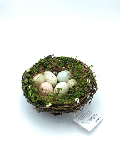 Wzór: Brązowe plastikowe gałązki z zielonym plastikowym mchem i sześcioma kolorowymi pisankami
