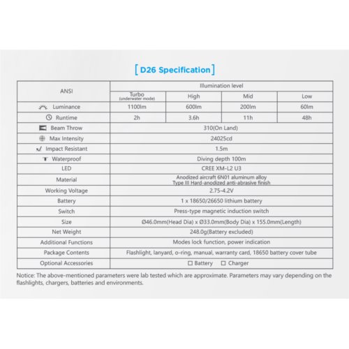 Latarka wyposażona jest w antyrefleksową, mineralną szybkę z grubego hartowanego szkła. I przy zastosowaniu ultra jasnego szkła, spełnia dobre warunki przepuszczalności, do 98,5% co umożliwia uzyskanie maksymalnej intensywności świecenia na poziomie 24025 kandeli. Światło tej latarki, różni się od modelu D26W, zimną barwą światła.