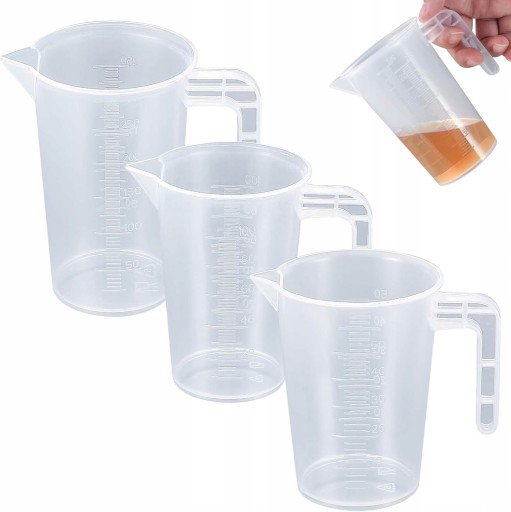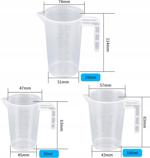 ①Zestaw 3 kubków z miarką, 50 ml, 100 ml, 250 ml, precyzyjne miarki z wagą, miarki do dozowania środków piorących, kuchni, laboratorium, gotowania