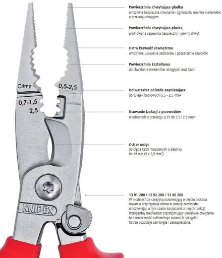 - Szczypce wielofunkcyjne do prac elektroinstalacyjnych; umożliwiają chwytanie materiałów o płaskim i okrągłym przekroju, gięcie, gratowanie, cięcie i odizolowywanie przewodów oraz zagniatanie tulejek kablowych