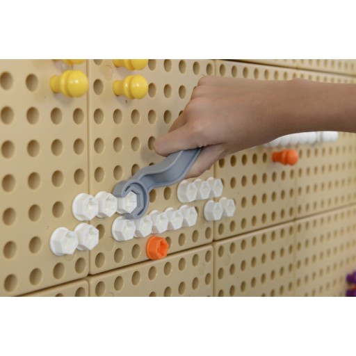 - - W zestawie ręcznych narzędzi do ścianki Naukowo-Kreatywnej Masterkidz, znajduje się śrubokręt z 4 wymiennymi końcówkami, klucz, wkrętarka (z lampką ułatwiającą wkręcanie), oraz półeczka do przechowywania.