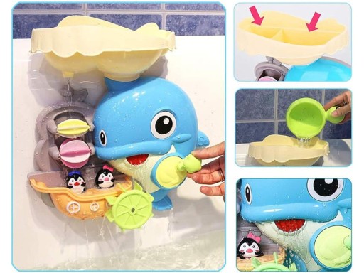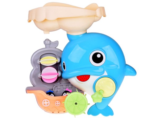 - Atrakcje wesołego delfinka:- delfin posiada specjalne pojemniki w kształcie zielonego żółwia oraz pomarańczowej płaszczki, dzięki którym można przelewać wodę- beżowy pojemnik do wlewania wody znajdujący się na jego głowie, wlewana do niego woda zaczyna obieg w zabawce dzięki temu rozpoczyna się zabawa- muszelka z ruchomą korbką pozwalająca poruszanie płetwą delfina
