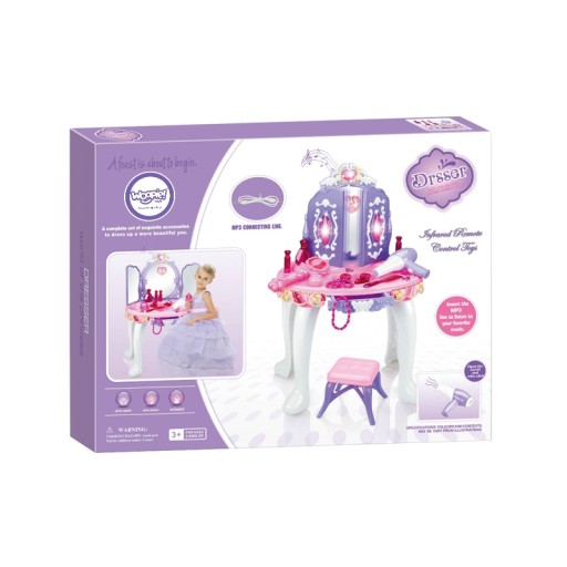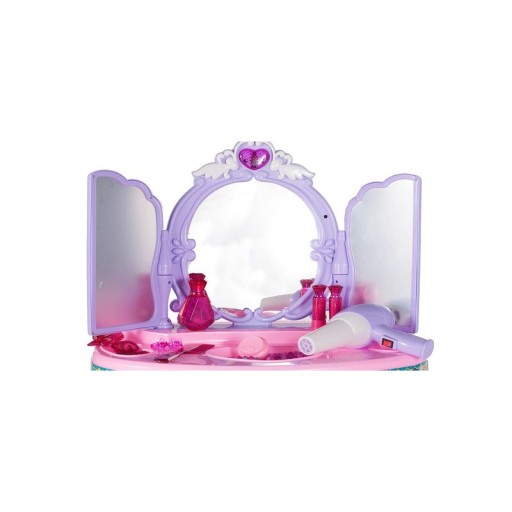 - Śliczna dziecięca toaletka w dziewczęcej kolorystyce od Woopie to idealna propozycja na prezent dla dzieci od 3 roku życia. Rozbudowany zestaw do robienia makijażu oraz fryzur zadowoli każdą posiadaczkę. Skrzydła lustra otwierane za pomocą magicznej różdżki, która działa na podczerwień, tak aby dziewczynka mogła poczuć się jak prawdziwa wróżka. Na lusterku pokazuje się postać królewny. Toaletka wyposażona jest również w efekty dźwiękowe i świetlne. Podczas otwierania lusterek gra muzyczka i migają światełka, natomiast gdy dziecko nie używa toaletki lustra automatycznie zamykają się. Lustro wykonane jest z niezbijalnego tworzywa co zwiększa bezpieczeństwo dziecka. Dołączona do zestawu suszarka do włosów na baterie pomoże stworzyć bajeczne fryzury i przenieść w świat małych modelek. Zabawka może służyć jako uzupełnienie Salonu Urody małych dziewczynek w pokojach. W zestawie kabel MP3, dzięki czemu podczas zabawy można słuchać ulubionej muzyki.Charakterystyka:
